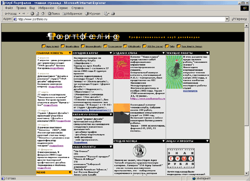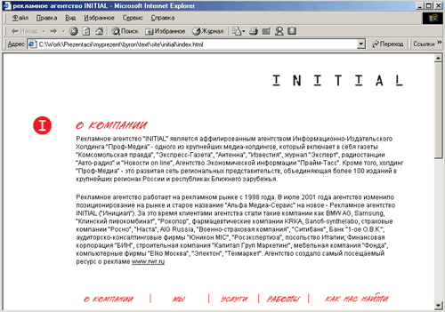 Http://www.initial.ru — html-кодирование странички —«заглушки» для рекламного агентства INITIAL (проект закрыт) http://www.rwr.ru редизайн сайта „Реклама в России“(проект изменен)http://www.uniqueics.biz/ru/ — дизайн шаблонов страниц (проект изменен)http://www.directdesign.ru — верстка html-версии сайта для дизайн студии „Директ Дизайн“ (проект изменен)http://www.portfelio.ru — верстка сайта для клуба профессиональных дизайнеров-графиков „Портфелио“. (проект закрыт)http://www.vashamarka.ru — страничка-«заглушка» для дизайн-студии „Ваша Марка“(проект закрыт)