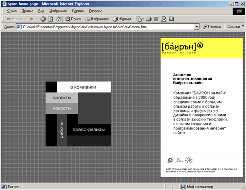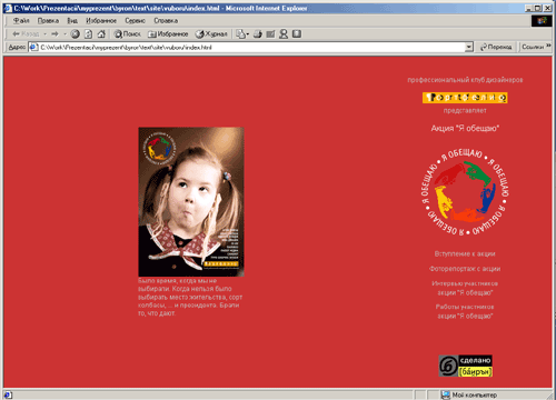 Все закрытые проекты, flash-ролики, презентации представлены на диске презентации работ.http://www.byron.ru — верстка html-версии корпоративного сайта Интернет-агентства „Байрон“ (проект закрыт)http://www.interpharmacy.ru сайт для «Международной аптеки» — дизайн и версткаhttp://www.nashamarka.ru — сайт посвящен созданию и продвижению отечественных торговых марок и марочных товаров. Полная версия каталогов „Наша марка“ дизайн и верстка. ( проект заркыт)http://www.helmut-fischer.ru — сайт для web-представительства международной компании HELMUT FISHER, производящей контрольно-измерительную аппаратуру. Дизайн сайтаhttp://www.vitrina.ru — оптимизазия flash-версии сайта. Сайт для Гастроэнтерологической Ассоциации. Html-Верстка. (Проект закрыт)Сайт , посвященный акции «Я обещаю», проводимый клубом профессиональных дизайнеров-графиков „Портфелио“. Дизайн и верстка (проект закрыт)